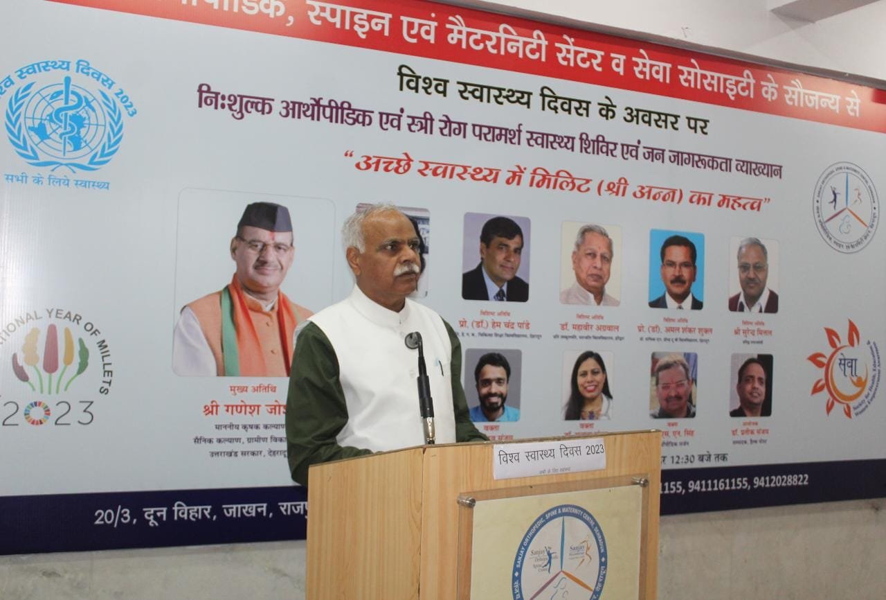 देहरादून। संजय ऑर्थोपीडिक स्पाइन एवं मैटरनिटी सेंटर एवं सेवा सोसाइटी ने विश्व स्वास्थ्य दिवस के अवसर पर “अच्छे स्वास्थ्य के लिए मिलिट का महत्व“ पर संगोष्ठी का आयोजन किया। कार्यक्रम के मुख्य अतिथि गणेश जोशी माननीय कृषि एवं कृषक कल्याण, सैनिक कल्याण, ग्रामीण विकास मंत्री उत्तराखंड सरकार, विशिष्ट अतिथि प्रो. (डाॅ.) हेम चंद्र पांडे जी, कुलपति, हे. न. ब. चिकित्सा शिक्षा विश्वविद्यालय, देहरादून, डाॅ. महावीर अग्रवाल, प्रति उपकुलपति, पतन्जलि विश्वविद्यालय, हरिद्वार, प्रो. डाॅ. अमल शंकर शुक्ल, प्रो. ग्राफिक एरा, डीम्ड टू बी विश्वविद्यालय, देहरादून, सुरेन्द्र मित्तल, प्रसिद्ध समाजसेवी एवं डाॅ. एस. एन. सिंह, ऑर्थोपीडिक सर्जन, डाॅ. सुजाता संजय, स्त्री एवं प्रसूति रोग विशेषज्ञ एवं ऑर्थोपीडिक सर्जन डॉ. गौरव संजय ने दीप प्रज्ज्वलित कर कार्यक्रम का शुभारंभ किया।