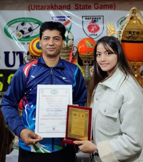 देहरादून। उत्तराखंड के नेशनल फुटबाल कोच और क्लास वन रेफरी देहरादून फुटबाल अकैडमी के संस्थापक अध्यक्ष और हेड कोच, 7 अंतराष्ट्रीय, 23 राष्ट्रीय और 21 स्टेट अवार्ड से सम्मानित, सामाजिक कार्यकर्ता, खेल के विकास के लिए जीवन समर्पित, उत्तराखंड आंदोलनकारी, 2022 के युवा नेता वीरेन्द्र सिंह रावत ने अपने ऑफिस अपर नथनपुर इंद्रप्रस्थ कालोनी देहरादून मे बुलाकर उत्तराखंड की पहली फुटबॉल महिला खिलाड़ी अनीता रावत को उत्तराखंड फुटबाल रत्न अवार्ड 2019 बेस्ट प्लेयर और 2020 बेस्ट फुटबॉल कोच गर्ल्स टीम के अवार्ड से नवाजा।