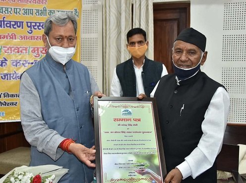 देहरादून। मुख्यमंत्री तीरथ सिंह रावत ने केन्ट रोड स्थित कैंप कार्यालय में नरेन्द्र सिंह नेगी को केदार सिंह रावत पर्यावरण पुरस्कार प्रदान किया। सी.पी. भट्ट पर्यावरण एवं विकास केन्द्र द्वारा आयोजित इस कार्यक्रम में नरेन्द्र सिंह नेगी को गायन के माध्यम से पर्यावरण एवं वन संरक्षण के प्रति लोक चेतना विकसित करने के लिए यह पुरस्कार दिया गया।