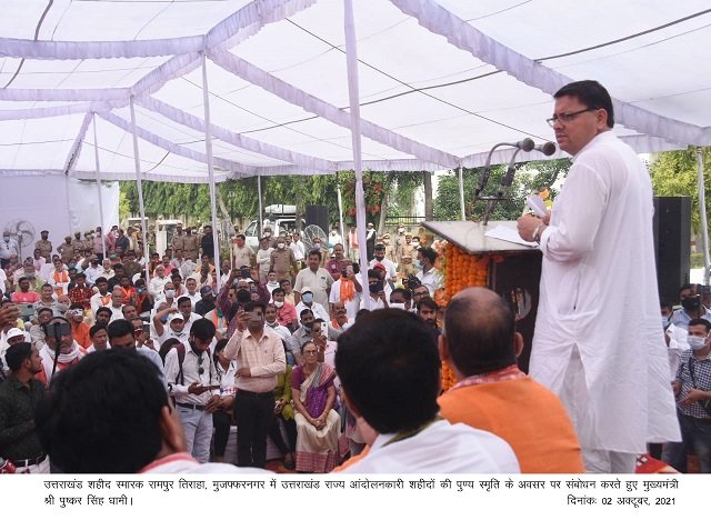 सभा को संबोधित करते हुए मुख्यमंत्री श्री पुष्कर सिंह धामी ने कहा कि मैं उन शहीदों को नमन करता हूं जिनके सर्वोच्च बलिदान की वजह से हमें उत्तराखंड राज्य मिला है। राज्य निर्माण आंदोलन के दौरान खटीमा, मसूरी एवं मुजफ्फरनगर में लाखों आंदोलनकारियों ने भाग लिया जिसमें से कई लोगों को अपनी जान गंवानी पड़ी। उन्होंने कहा उत्तराखंड राज्य का विकास शहीदों के सपनों के अनुरूप किया जाएगा। इसके लिए हमारी सरकार लगातार कार्य कर रही है। राज्य आंदोलनकारियों से जुड़ी समस्याओं का प्राथमिकता के आधार पर समाधान किया जाएगा। मुख्यमंत्री ने कहा कि 1 सितम्बर 2021 को घोषणा की थी कि राज्य आन्दोलनकारियों के चिन्हीकरण की प्रक्रिया फिर से शुरू की जायेगी, उसका शासनादेश भी जारी कर दिया गया है। हमारी सरकार जो भी घोषणा करेगी उसको हर हाल में धरातल पर उतारा जायेगा। राज्य आंदोलनकारियों एवं शहीदों का सपना था कि युवाओं को रोजगार के लिए भटकना न पड़े इसके लिए हमारी सरकार ने पहली कैबिनेट में यह फैसला लिया कि विभिन्न विभागों पर रिक्त चल रहे 24000 पदों पर भर्ती निकालेंगे, जिनमें आवेदन प्रक्रिया शुरू हो चुकी है युवाओं को स्वरोजगार से जोड़ने के लिए हर जिले में कैंप लगाए जा रहे हैं। इसक अलावा कोरोना से प्रभावित व्यवसायियों और स्वयं सहायता समूहों को क्रमशः 200 और 118 करोड़ के राहत पैकेज घोषित किये गये हैं जिनका पैसा प्रभावितों के खाते में आने लगा है। स्वास्थ्य के क्षेत्र में नई पहल करते हुए हमारी सरकार मरीजों को सरकारी अस्पतालों में 207 जांचें मुफ्त में करवाने की सुविधा दे रही है। कोरोना के कारण अनाथ और बेसहारा हुय बच्चों के भरण पोषण की जिम्मेदारी भी सरकार उठा रही है। इस अवसर पर केंद्रीय रक्षा राज्य मंत्री श्री अजय भट्ट, केंद्रीय मंत्री एवं सांसद मुजफ्फरनगर श्री संजीव बालियान, उत्तराखण्ड के कैबिनेट मंत्री स्वामी श्री यतीश्वरानंद, भाजपा उत्तराखण्ड प्रदेश अध्यक्ष श्री मदन कौशिक, मुजफ्फरनगर के विधायक श्री प्रमोद उडवाल, श्री राजेन्द्र अन्थवाल, प. महावीर शर्मा एवं अन्य गणमान्य उपस्थित थे।