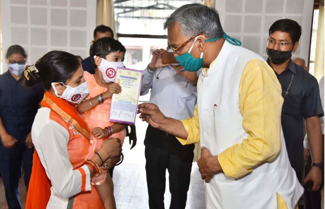 देहरादून। मुख्यमंत्री त्रिवेन्द्र सिंह रावत ने मुख्यमंत्री आवास स्थित जनता दर्शन हॉल में कुपोषण मुक्त उत्तराखण्ड के लिए शुरू किये गये गोद अभियान में कुपोषण मुक्त बच्चों के अभिभावकों को सम्मानित किया।