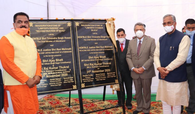 रूद्रपुर/देहरादून। सीएम त्रिवेन्द्र सिंह रावत एवं नैनीताल उच्च न्यायालय के कार्यवाहक मुख्य न्यायमूर्ति रवि मलिमथ द्वारा शनिवार को संयुक्त रूप से जजी परिसर रूद्रपुर में अधिवक्ता चेम्बर्स ब्लॉक एवं वाहन पार्किंग का लोकार्पण किया।