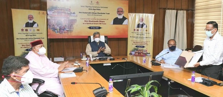 देहरादून। मुख्यमंत्री तीरथ सिंह रावत व केंद्रीय पेट्रोलियम मंत्री धर्मेंद्र प्रधान की मौजूदगी में आज श्री केदारनाथ उत्थान ट्रस्ट व तेल एवं प्राकृतिक गैस मंत्रालय की पब्लिक सेक्टर कंपनियों के मध्य श्री बदरीनाथ धाम को स्मार्ट स्पिरिचुअल टाउन के रूप में विकसित करने को लेकर लगभग 100 करोड़ के कार्यों के समझौता ज्ञापन पर हस्ताक्षर हुए। समझौता पत्र पर पेट्रोलियम मंत्रालय की ओर से सचिव तन्नू कपूर व उत्तराखण्ड की ओर से पर्यटन सचिव दिलीप जावलकर ने हस्ताक्षर किए।