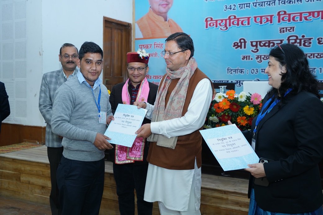 मुख्यमंत्री ने कहा कि प्रधानमंत्री नरेंद्र मोदी के नेतृत्व में सबका साथ-सबका विकास-सबका विश्वास और सबका प्रयास के मंत्र पर आगे बढ़ कर जनहित के कार्य किए जा रहे हैं। आज उत्तराखंड विकास और विश्वास के अभूतपूर्व माहौल में, जन आकांक्षाओं को पूरा करते हुए आगे बढ़ रहा है। विकसित उत्तराखंड का लक्ष्य हम सभी का सामूहिक लक्ष्य है और इसे सामूहिक प्रयासों से ही प्राप्त किया जा सकता है। उन्होंने प्रदेश के सभी युवाओं से अपील की कि उत्तराखंड को देश का श्रेष्ठ राज्य बनाने के हमारे “विकल्प रहित संकल्प“ की पूर्ति के लिए किये जा रहे प्रयासों में सहयोगी बनें। इस अवसर पर निदेशक पंचायती राज निधि यादव ने पंचायती राज विभाग की कार्ययोजना की जानकारी दी। कार्यक्रम में विधायक दुर्गेश्वर लाल, अपर सचिव पंचायती राज आलोक कुमार पाण्डेय, संयुक्त निदेशक आर. के. एन. त्रिपाठी, उप निदेशक मनोज कुमार तिवारी, नोडल अधिकारी अतुल प्रताप सिंह, नवनियुक्त कार्मिकों सहित सम्बंधित अधिकारी उपस्थित रहे।